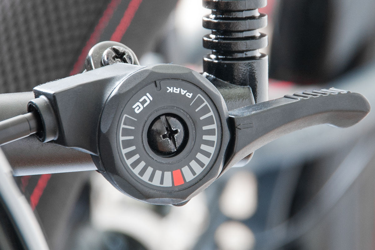 This thumb lever with locking function is ideal for locking the rear wheel v-brake of your recumbent trike. This provides reliable security against unwanted movement at all times. If you want to retrofit a complete rear wheel v-brake, this parking brake lever is also available in a complete set.